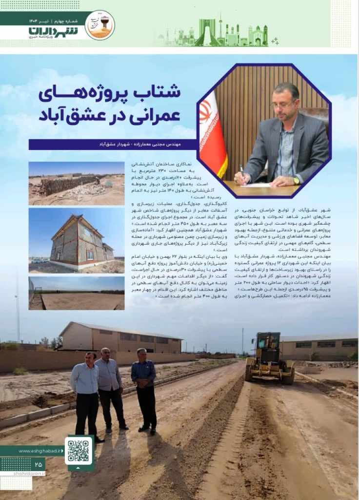 🔸شهردار عشق آباد همچنین اظهار داشت : آماده سازی و زیرسازی زمین چمن مصنوعی شهرداری در محله زیرک آباد از دیگر پروژه های جاری شهرداری است.